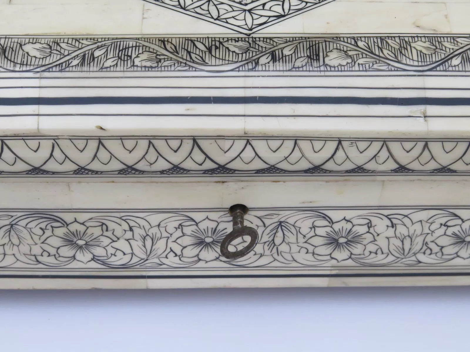 This Antique 19th Century Anglo-Indian Box (Age:1850-1899) is constructed from a real solid very expensive white material and sandalwood. The top, the sides, the front and the back are extravagantly decorated with inlayed pattern. (Please see the photos). The lid has very good butt fit to the box. The lid is attached to the main box with two brass hinges. Lock with key fully functional.